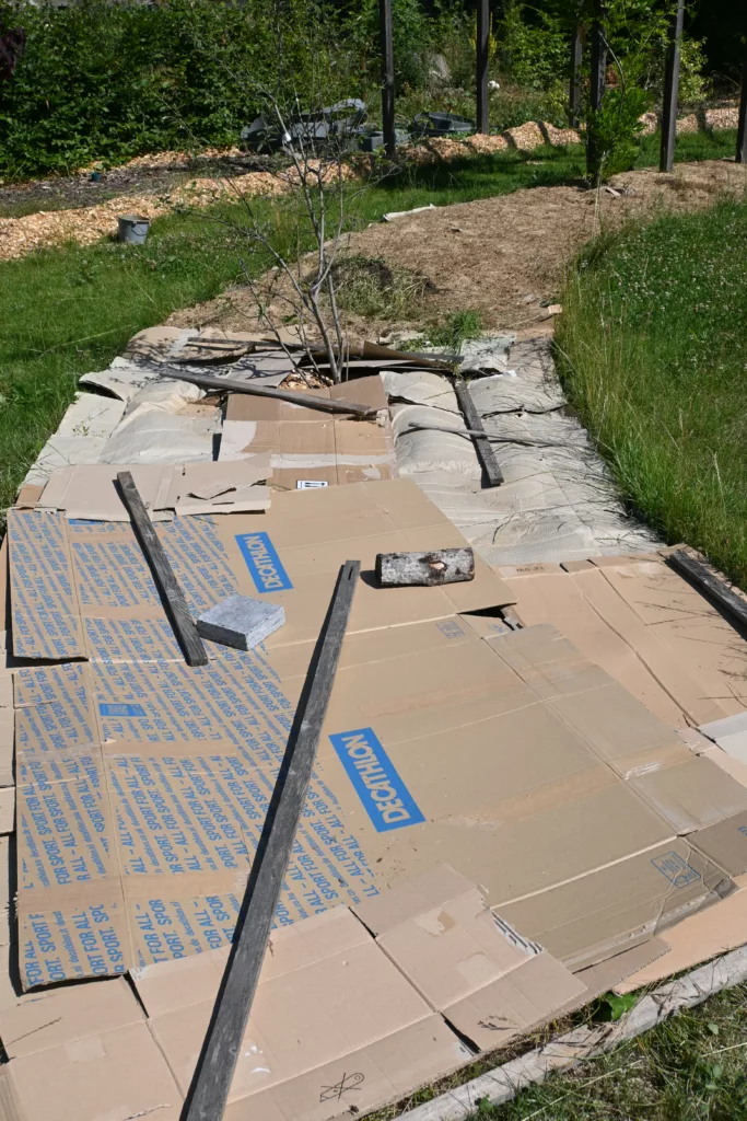 Dans un premier temps, je dispose directement sur l’herbe ou les adventices des cartons récupérés (sans encre ni papier collant si possible) pour les étouffer.